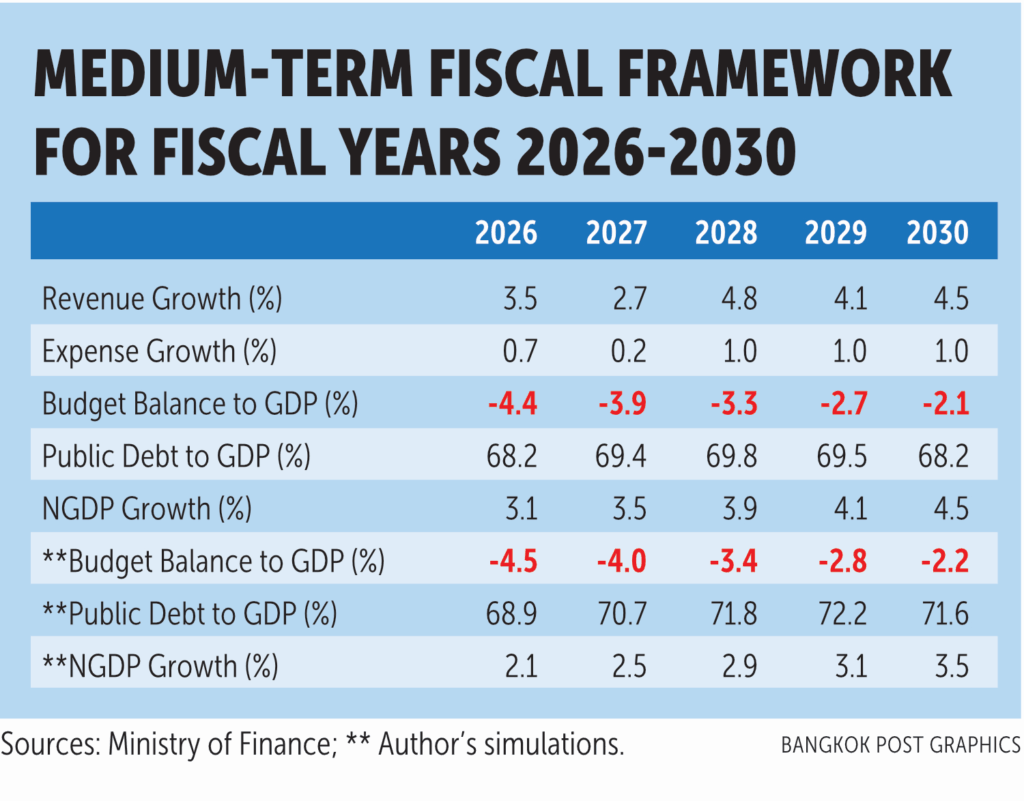 This article does not criticize Finance Minister Ekniti Nitithanprapas’s Medium-Term Fiscal Framework (MTFF) for FY2026-FY2030 but highlights Thailand’s fragile fiscal position, which requires multiple revenue measures. Although the MTFF includes VAT hikes of 1.5% in FY2028 and FY2030, these alone are unlikely to reduce the deficit below 3% of GDP, necessitating additional taxes, possibly a petrol tax hike of 2 baht per litre in FY2029.